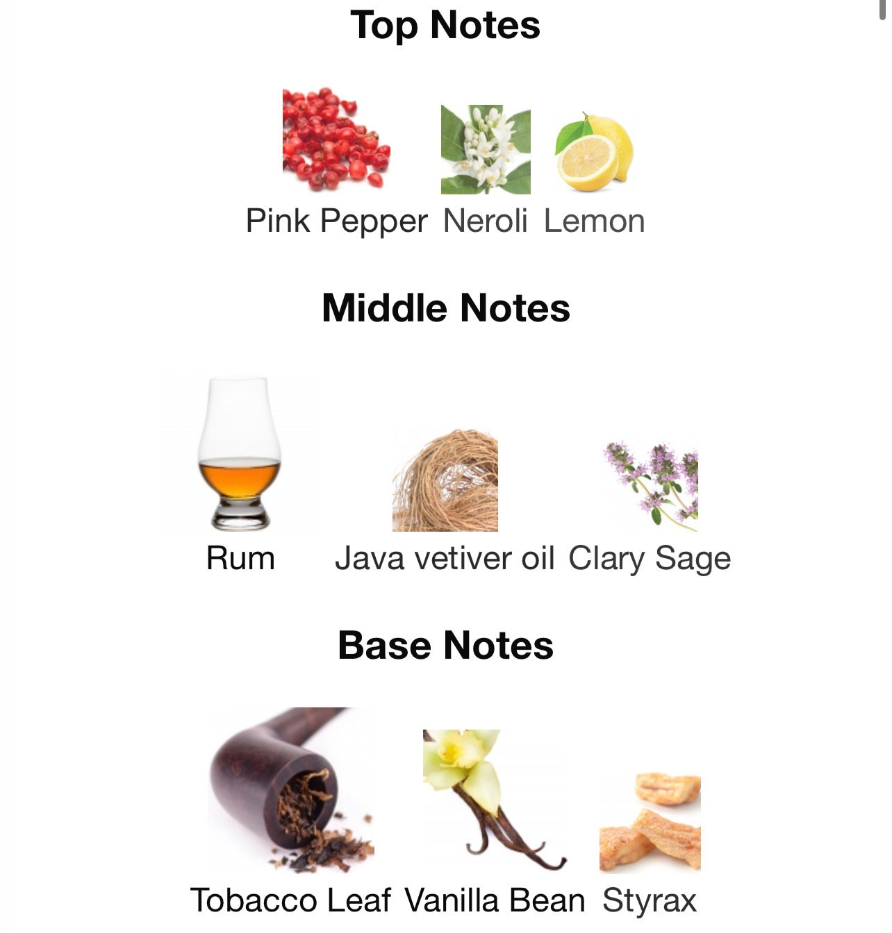 Base notes: Tobacco Leaf, Vanilla Bean, Styrax